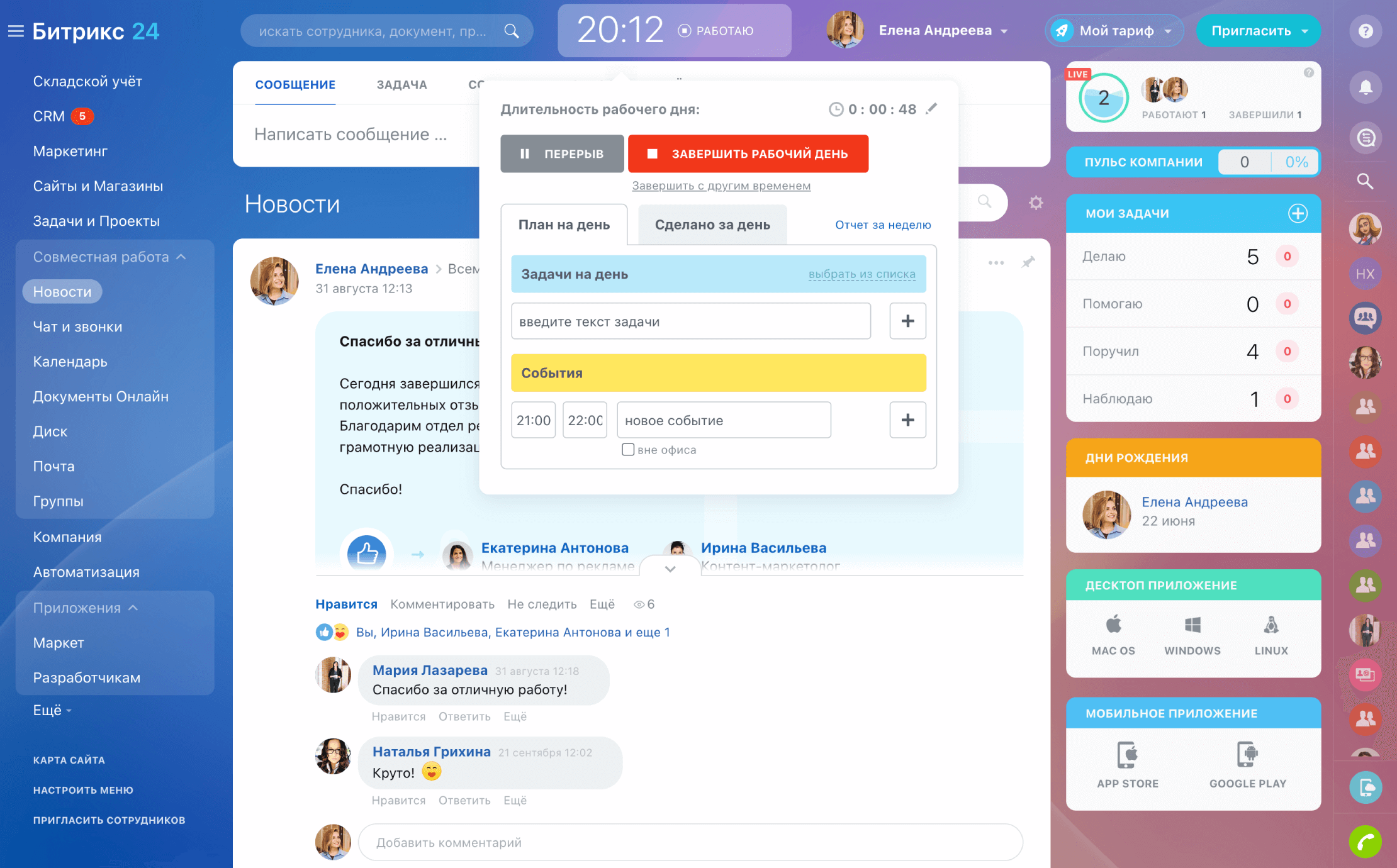 Управляйте рабочим временем эффективно с Битрикс24. Начинайте, прерывайте и заканчивайте рабочий день в один клик, ведите учет рабочего времени и составляйте отчеты на лету.